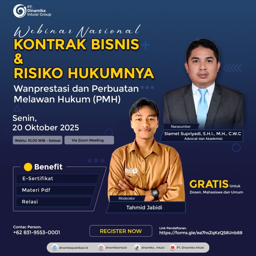 PT. Dinamika Intuisi Group sukses menyelenggarakan Webinar Nasional bertajuk “Kontrak Bisnis dan Risiko Hukumnya: Wanprestasi dan Perbuatan Melawan Hukum (PMH)”. Kegiatan ini menghadirkan akademisi sekaligus praktisi hukum berpengalaman yang membedah tuntas isu penting dalam dunia bisnis modern.